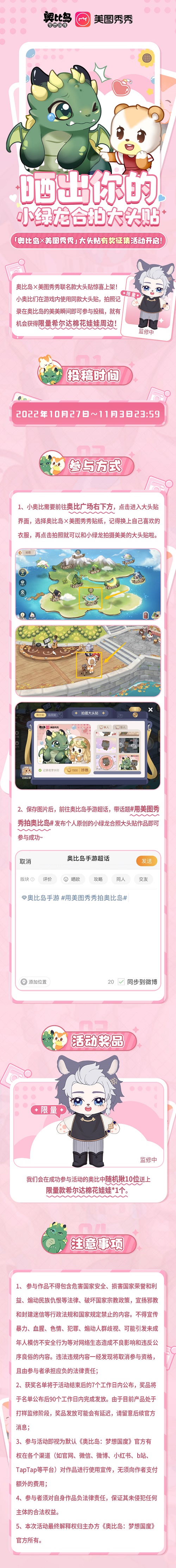 前往微博奥比岛手游超话,带话题#用美图秀秀拍奥比岛#,发布个人原创的小绿龙合照大头贴作品即可参与。
