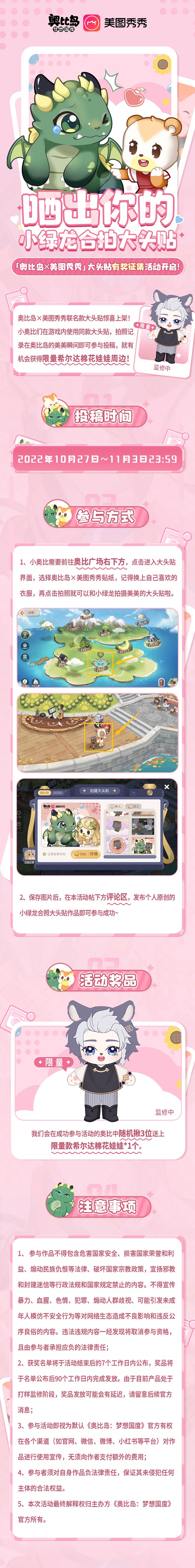 在B站动态投稿中带上标签#用美图秀秀拍奥比岛,发布个人原创的小绿龙合照大头贴作品即可参与。