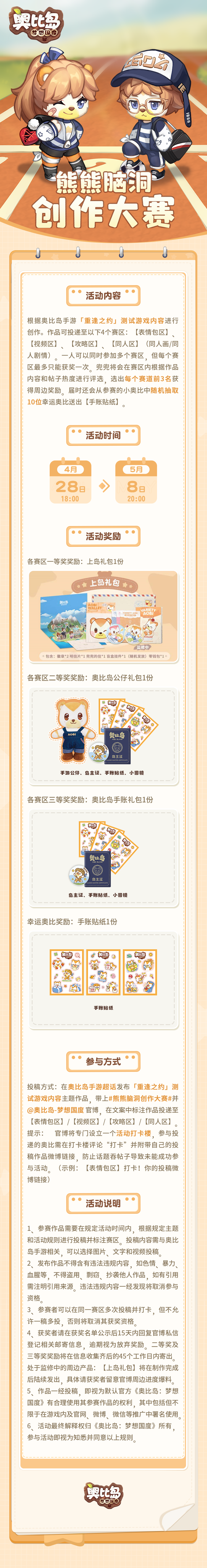 奥比岛上处处是宝藏!看到岛上可爱的熊和事,奥比们是不是一不小心就能脑洞大开,迸发出创作灵感呢?比如看到一张笑脸就想做成表情包,站在码头上就想拍一部泰坦尼克号……快把你在奥比岛上获得的灵感,投入到创作中吧!关注《奥比岛-梦想国度》官方微博,参与“奥比岛熊熊脑洞大赛”投稿活动,就有机会获得超萌周边~