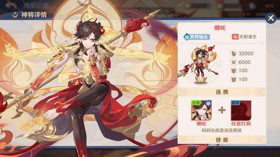 在游戏中,哪吒是一位输出型神将,拥有“跨阵营输出”与“无限重生”两大超强力机制。虽然隶属于仙阵营,但根据其【心领神会】的连携技能,哪吒可以搭配任意红将激活连携技的增伤效果,并改变自身阵营类型!而在法宝“火莲乾坤圈”的加持下,其【化身】的能力可以使得哪吒在队友未全部阵亡的情况下无限重生!相信在哪吒的加入下,各位守护使将获得更加自由百变的策略搭配体验!