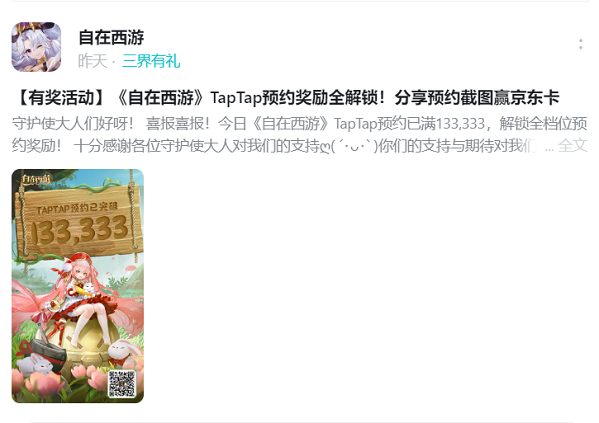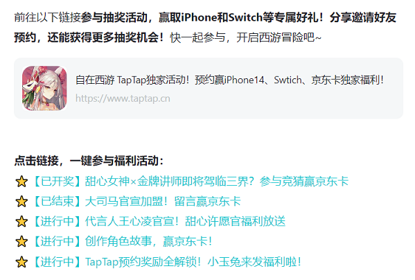 除了常规的预约奖励外,《自在西游》在TapTap和好游快爆两个游戏社区也开启了有奖预约活动。在这些渠道预约的玩家,除了能领到官方的里程碑奖励外,还有机会参与京东卡瓜分、限时抽奖等活动哦: