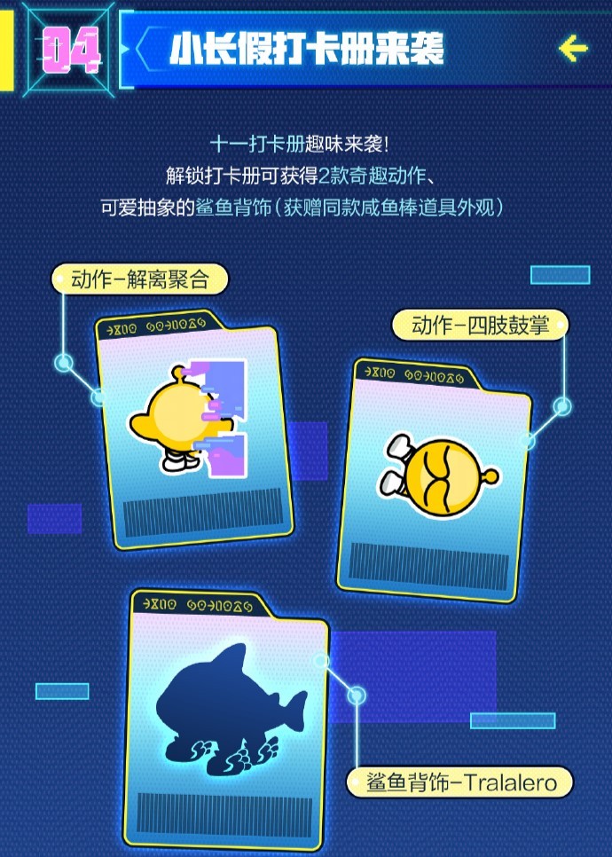 十一打卡册趣味来袭!解锁打卡册可获得2款奇趣动作、可爱抽象的鲨鱼背饰(获赠同款咸鱼棒道具外观)!
