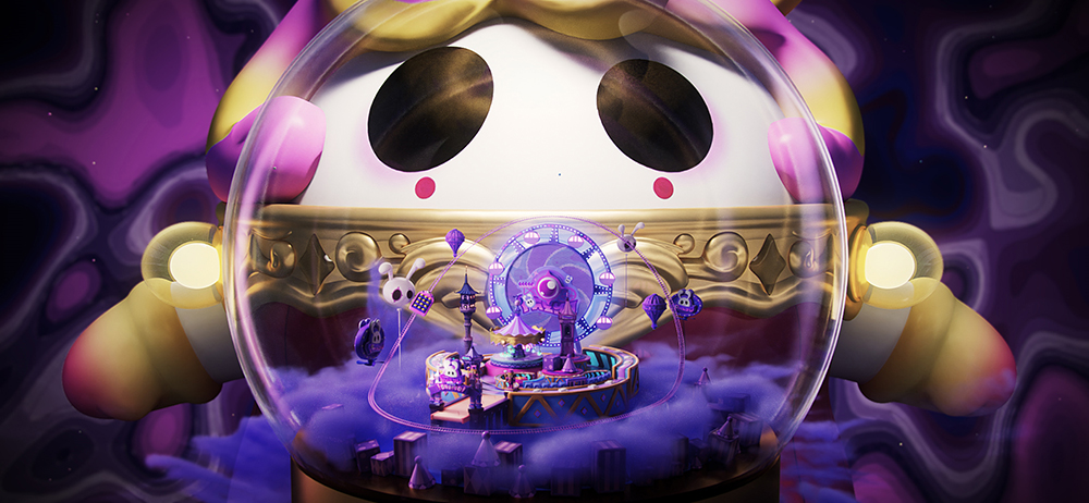 粉紫与奶油黄的的渐变搭配极为梦幻,浑身造型更是细节满满。裙撑将华丽的外套撑起,既避免了走路时误踩衣摆的风险,又使得外套更加高贵有形。翡翠般莹润的旋转木马在[欢宴园长]肚中欢快地转动,随身携带的留声机发出咿咿呀呀的奏乐。