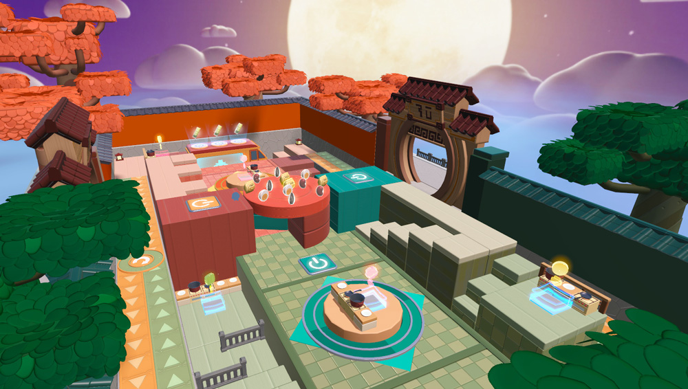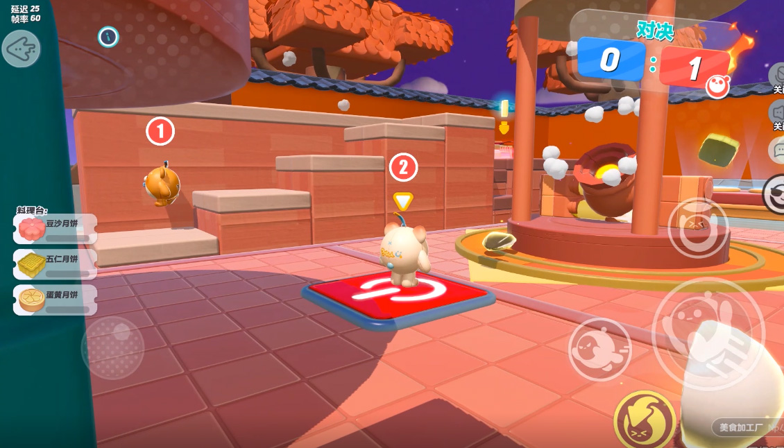 场中设有多个<开关>按钮,小队成员可以利用<开关>升起炮台,干扰对手。也可以相互配合,利用<开关>控制己方地形的改变,高效完成月饼制作任务,获得更多的积分!