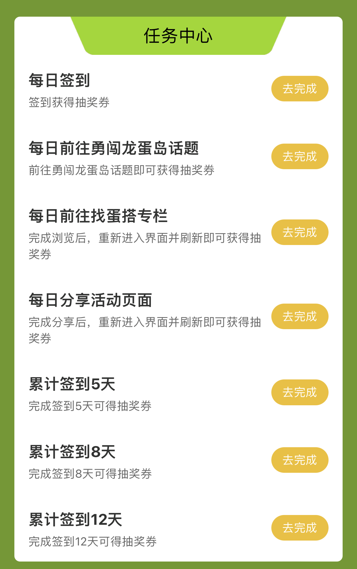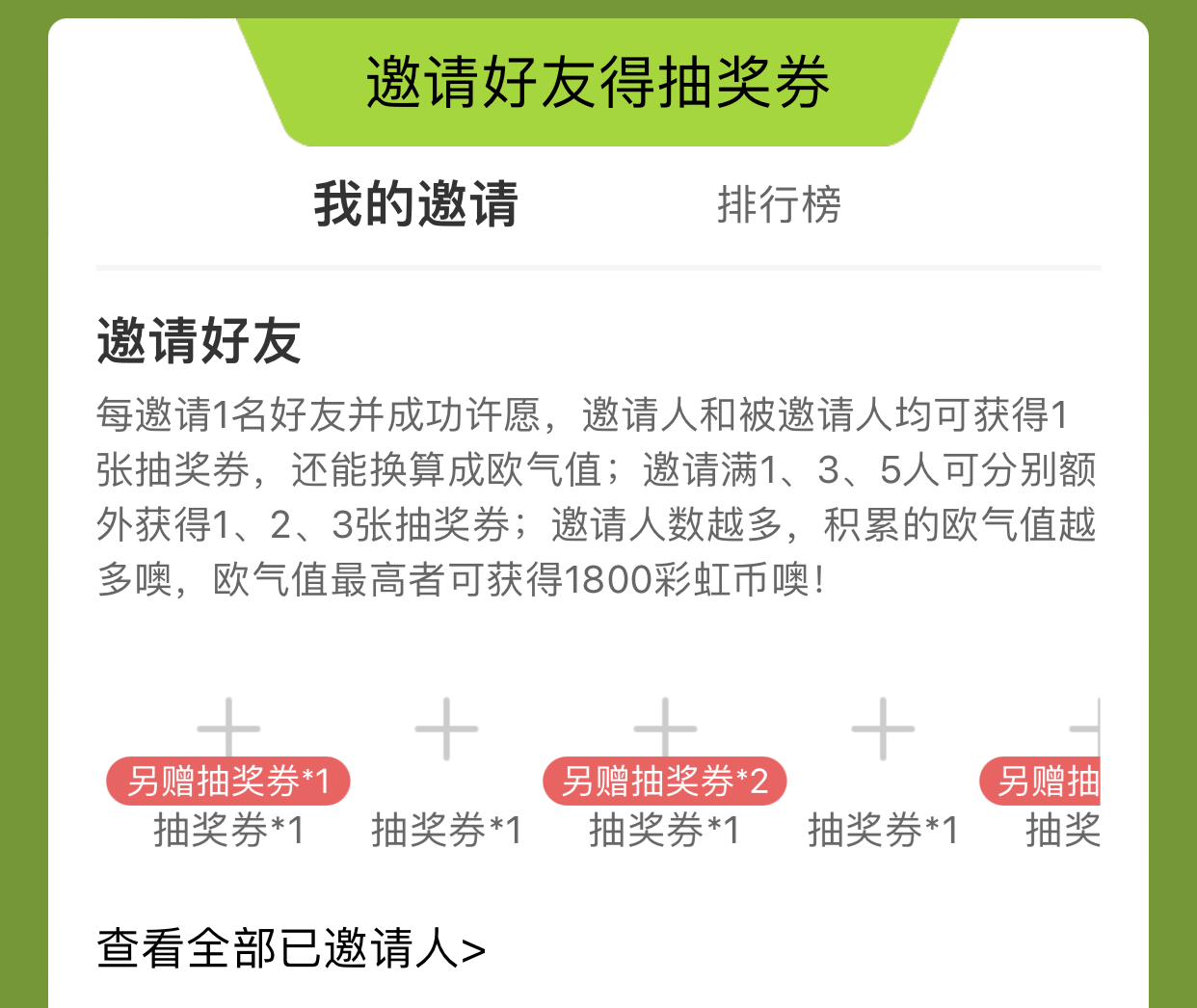 活动期间,参与许愿活动后下滑进入任务中心,完成任务即可获得抽奖券,抽取更多精彩好礼。此外,每邀请1名好友并成功许愿,邀请人和被邀请人均可获得1张抽奖券,还能换算成欧气值;邀请满 1、3、5人,可分别额外获得抽奖券!邀请人数越多,积累的欧气值越多!