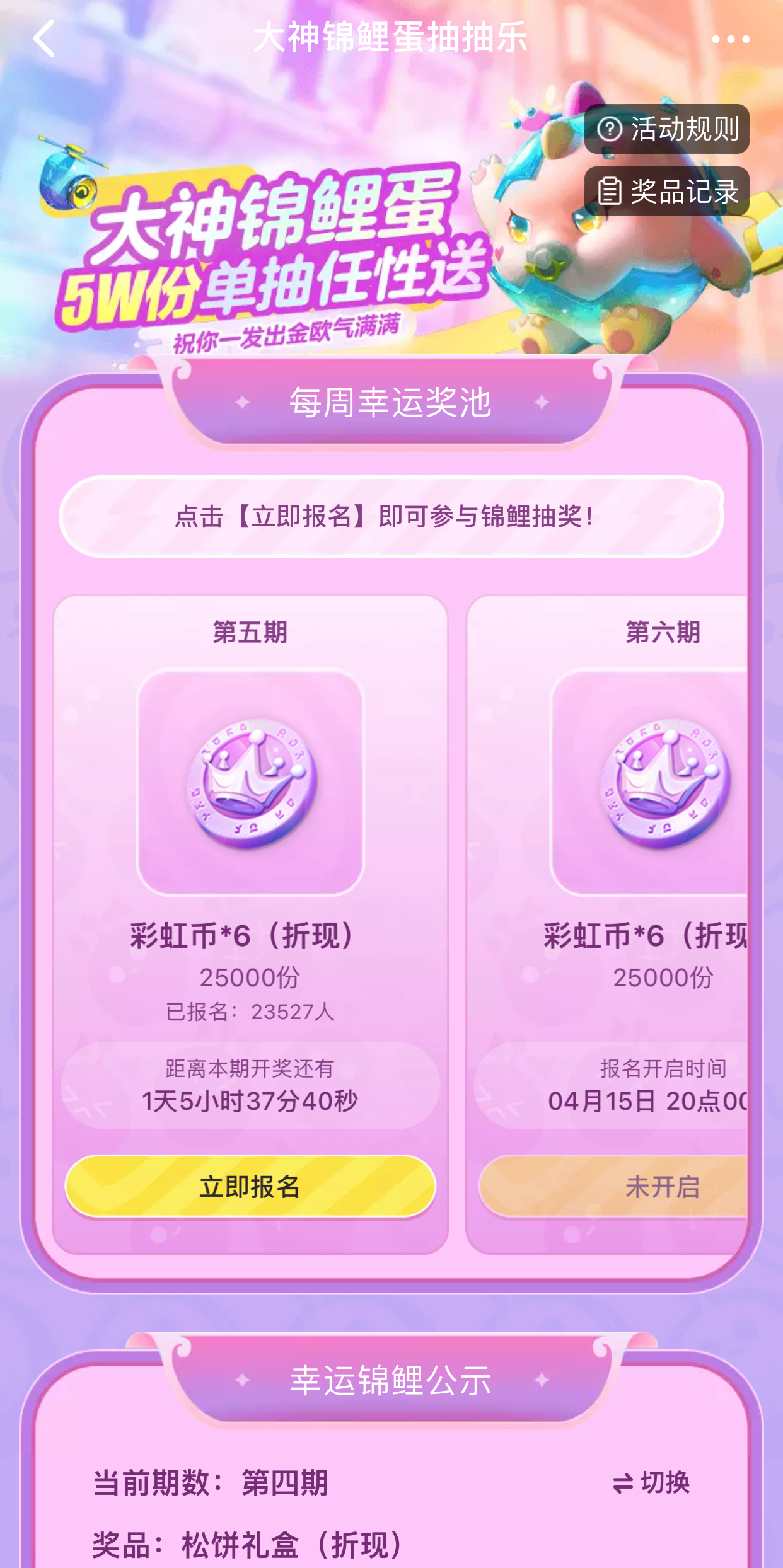 好运来,好运来,好运从四面八方来~大神锦鲤蛋抽抽乐活动福利不停,参与即有机会抱走满满彩虹币!第五期开奖已进入倒计时,一共5万份彩虹币*6中奖名额,蛋仔们快来大神APP参与抽奖,领取惊喜好礼!第六期将在4月15日开启报名,心动不如行动,下一个锦鲤就是你!