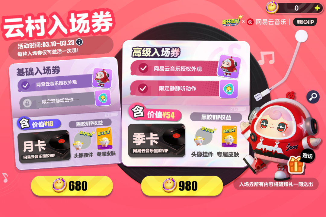 3月10日至3月23日期间,购买云村入场券即可获得对应礼包内容。解锁“基础入场券”可得联动外观、网易云音乐黑胶VIP月卡;解锁“高级入场券”,除联动外观外,还可获得限定动作“静静听”及网易云音乐超值黑胶VIP季卡。