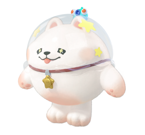 雪白的被毛厚实又柔软,耳朵、肚皮与爪爪泛着健康的粉色,“萨摩耶莱卡”即使来到不熟悉的太空也依然充满元气与活力。星体在宇宙闪耀,璀璨的星辉也落入了他的眼眸,让这只忠诚可爱的狗狗心驰神往,露出更加阳光的笑容,“我把那颗星星叼来送你吧!”但在那之前,希望“萨摩耶莱卡”可以早点发现,他把玻璃鱼缸错当成防护头盔戴上啦!