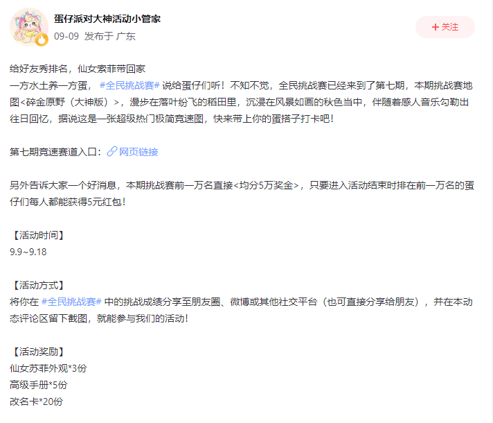 竞速热潮再度延续,冲刺排名瓜分总金额14万奖金!即日起至9月18日,上大神APP《蛋仔派对》圈子,进入全民挑战赛活动页面即可直达本期挑战地图《碎金原野(大神版)》,全国排名前一万名的蛋仔就可均分奖金5万元!漫步在金灿灿的稻田上,绝美秋色尽收眼底~别忘了还有红包等你来瓜分噢!