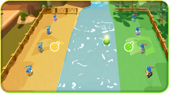 绿洲瀑布地图分为三块区域:己方阵营区、河道、敌方阵营区。游戏开始与被击败后复活时,蛋仔都将现身在己方阵营区。蛋仔们的作战目标,是将敌方蛋仔用爪爪抓至己方阵营区,并将其击败;若是不幸被抓至敌方阵营区,则需要努力保全自己脱离围困。而中间的河道,不仅是主动出击前往敌方阵营区的必经之路,更漂浮着许多有用的道具。不过要注意的是,置身河道的蛋仔将会被减速并禁用爪爪技能,成为敌方出爪的“活靶子”,可谓危险与机遇并存。