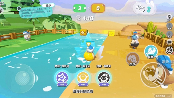 在对局中,蛋仔们将携带“爪爪”和“咸鱼”两个基础技能,分别可以将敌方蛋仔抓至自己身边和对敌方蛋仔进行攻击。游戏开始一段时间后,蛋仔们还将会获得一次选择决战技的机会,通过选择合适的决战技能和对应作战策略,发挥出敌方意料之外的奇效。此外,在河道中会有不同道具漂浮而来,同样能为对决带来更多的变化与欢乐,可通过使用爪爪抓取获得或直接进入河道触碰道具。