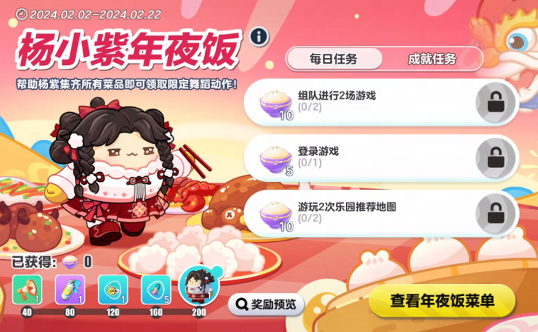新春上岛活动不断,杨小紫请吃年夜饭!2月2日至22日,【杨小紫年夜饭】活动限时开启,蛋仔们完成任务收集菜品,即可免费获取专属定制外观“杨小紫”、表情“射中你的心”及杨紫限时快捷语音等丰富奖励!