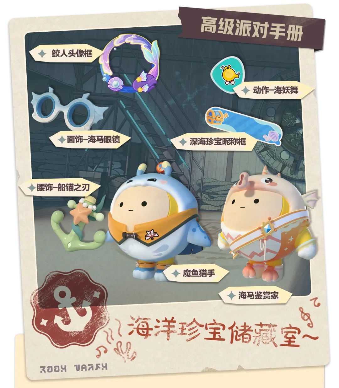 将派对手册升级为高级后,还能获得总价值3288蛋币的超值奖励。除了300蛋币、30彩虹币、20盲盒染色剂、20配饰染色剂外,还可获得稀有盲盒“海马鉴赏家”、典藏配饰“海马眼镜”、稀有头像框“鲛人头像框”、高级昵称框“深海珍宝昵称框”、典藏动作“海妖舞”、典藏配饰“船锚之刃”和稀有盲盒“魔鱼猎手”外观。