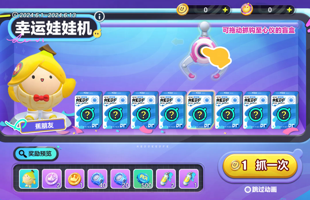 美好的童心旅程,从“蕉”个默契的新朋友开始!6月1日至6月13日,【幸运娃娃机】限时开启,8次内必定获取全新外观“蕉朋友”!