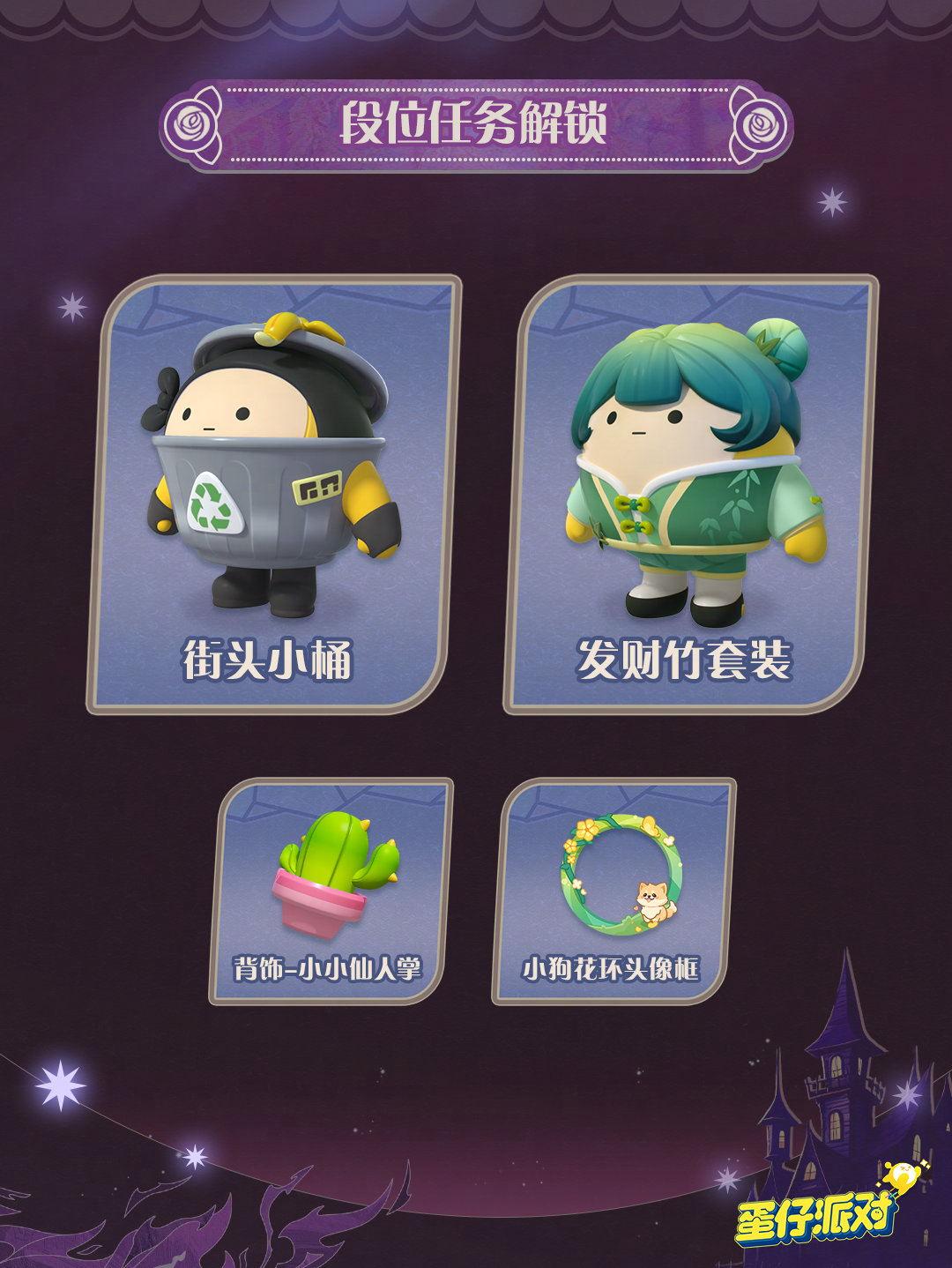 “圆月哥特”派对季开启后,游戏将根据段位继承规则对玩家段位进行降级继承。与此同时,新派对季的开启也带来了新的段位任务,完成指定任务,即可领取外观“发财竹套装”、 “街头小桶”,配饰“小小仙人掌”,及“小狗花环头像框”等丰厚奖励!