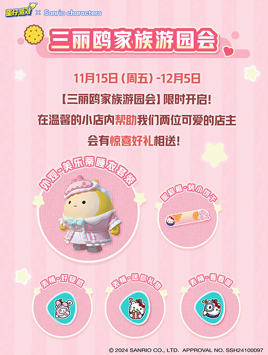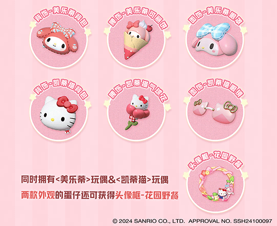 沉沉入梦乡,可爱不打烊,11月15日,国民原创乐园游戏《蛋仔派对》× 三丽鸥家族联动2.0开启!甜度爆表的Hello Kitty、美乐蒂玩偶进入蛋仔们的梦境,甜美外观、联动配饰、农场套装等超多好礼等你解锁,快上岛加入她们的甜品店,共同编织甜蜜梦乡!