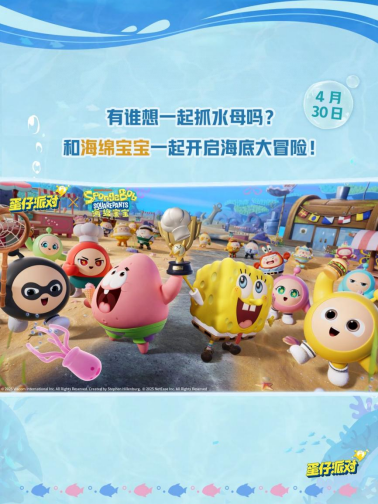 小蛋仔,一起抓水母吧!4月30日,《蛋仔派对》×《海绵宝宝》联动重磅开启,免费福利、蛋仔岛趣味活动、联动外观配饰、农场装扮同步上线!