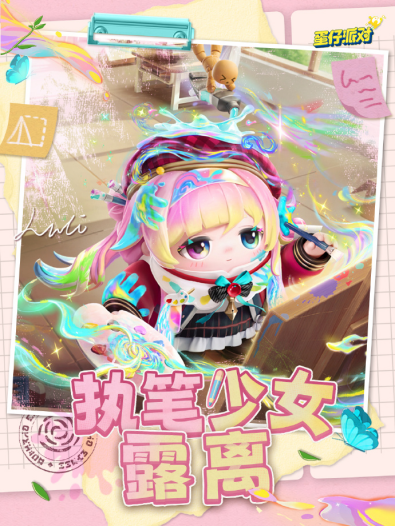 执笔少女露离是一个擅长油画的学生小画家,戴着钢笔领结、调色盘胸针和画课堂随笔时设计出来的星星造型发饰;固定发髻的画笔、帽子上的油画材质颜料特效流动;坐在露离头顶颜料管上的小木头人,还承载着她与朋友间的重要回忆;还有她身上特殊的手印、画着叉叉的纸条又隐藏着什么秘密?