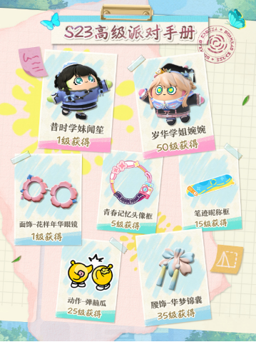“绘梦校园”派对季的派对手册分为基础版和高级版两部分,相应的奖励各不相同。本季基础派对手册的全部奖励有:800潮流纤维、17500瓶盖、稀有表情“憨憨敬礼”、高级头像框“对话头像框”、稀有配饰“橡皮擦”、高级装扮“资深教师套装”。