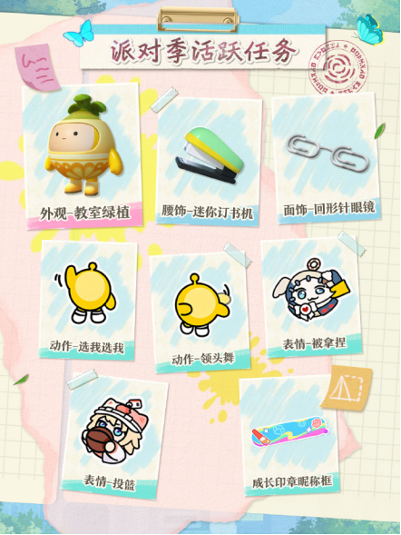 “绘梦校园”派对季活跃活动正式开放!完成全新派对季活跃任务,即可前往兑换商店获取稀有盲盒“教室绿植”、稀有配饰“迷你订书机”、“回形针眼镜”,更有赛季限定全新表情“被拿捏”、“投篮”,动作“选我选我”、“领头舞”,和“成长印章昵称框”等奖励等待兑换。