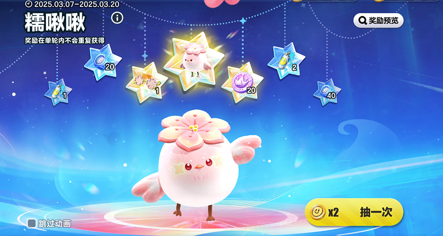 3月7日0点,“糯啾啾”上线。小蛋仔们使用许愿币即可参与抽奖,7轮内必得!