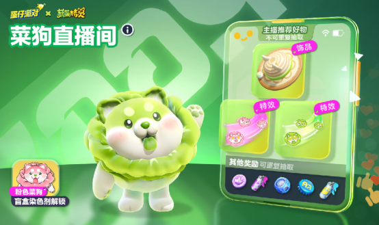 菜狗直播间开启,萌翻全岛的白菜狗登场!柔软的嫩绿色菜叶层层包裹,肉肉的脸颊透出健康的粉红,3月14日(周五)起,参与抽奖即可解锁联动外观<白菜狗>,使用盲盒染色剂,即可解锁<白菜狗▪粉色>,还有超萌的背饰、滚动特效等你来拿~