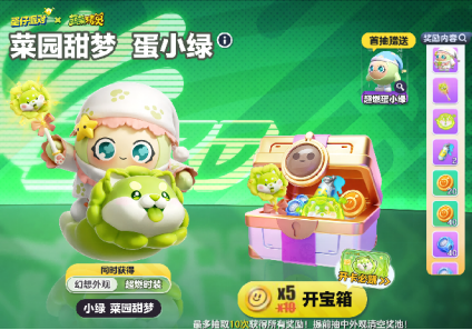 3月14日(周五),超燃竞技场甜蜜上新,蛋小绿挥动魔法棒,开启美梦时间。超燃时装&幻想外观<菜园甜梦>、超燃武器&同款背饰<菜灵魔法棒>、联动决战技外观<变形术-白菜狗>等好物等你抽取;活动期间首抽即赠幻想时装<超燃蛋小绿>,提前成功获取蛋小绿<菜园甜梦>的蛋仔还可清空奖池内所有缤纷好礼。