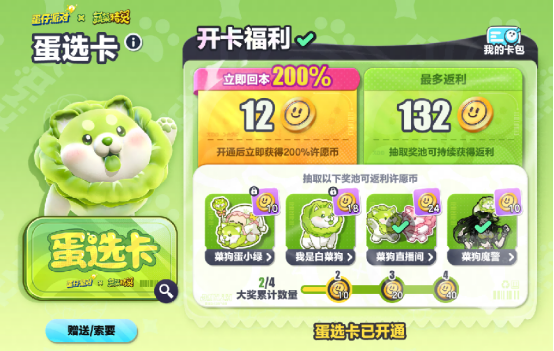 春季福利千千万,菜狗汪汪来相伴。「蛋选卡 x 菜狗」联名款将于3月14日重磅上线,开卡立即回本200%。参与抽取蔬菜精灵系列联动奖池,可持续获取返利,至多可获取132枚许愿币!