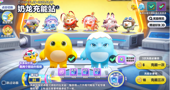 奶龙充能站,好礼享不停!1月29日至2月20日,参与“奶龙充能站”奖池,抽奖可获得大量能量和随机奖励,当能量进度到达指定档位时,可领取彩虹币,表情、配饰、动作、外观自选宝箱大奖!集齐奶龙和暴暴龙外观还可领取头像框和新春奶龙幻化剂(使用后可获得新春奶龙外观),首抽还可获得“不服气”动作!