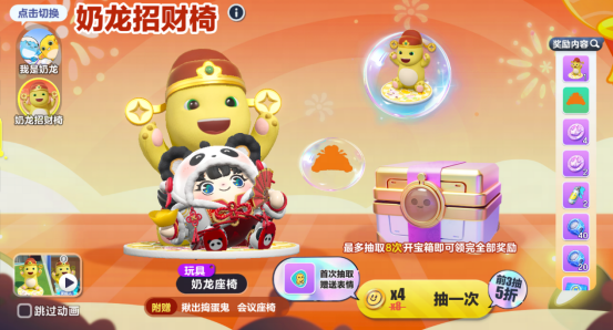 奶龙招财椅,一坐就发财!1月29日-2月20日,小蛋仔们可在奶龙联动中抽取“奶龙招财椅”宝箱,前3抽5折优惠!首抽即送联动表情,还有更多其他奖励!
