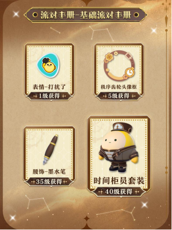 “时之回响季”派对季的派对手册分为基础版和高级版两部分,相应的奖励各不相同。本季基础派对手册的全部奖励有:800潮流纤维、17500瓶盖、稀有表情“打扰了”、高级头像框“秩序齿轮头像框”、稀有配饰“墨水笔”、高级装扮“时间柜员套装”。