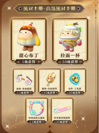 将派对手册升级为高级后,还能获得总价值3288蛋币的超值奖励。除了300蛋币、30彩虹币、20盲盒染色剂、20配饰染色剂外,还可获得稀有盲盒“甜心布丁”、典藏配饰“鱼板眼镜”、稀有头像框“特别放映头像框”、高级昵称框“时光便签昵称框”、典藏动作“上发条”、典藏配饰“拉面拍档”和稀有盲盒“拉面一杯”外观。