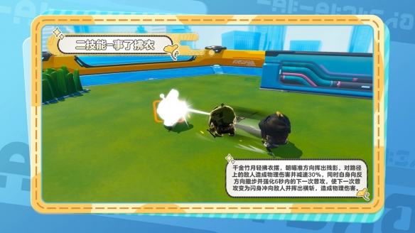 施展二技能“事了拂衣”时,千金竹月轻拂衣摆,朝瞄准方向挥出残影,对路径上的敌人造成物理伤害并减速30%,同时自身向反方向撤步并强化6秒内的下一次普攻,使下一次普攻变为闪身冲向敌人并挥出横斩,造成物理伤害。