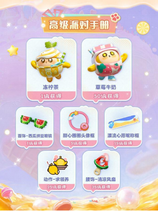 将派对手册升级为高级后,还能获得总价值3288蛋币的超值奖励。除了300蛋币、30彩虹币、20盲盒染色剂、20配饰染色剂外,还可获得稀有盲盒“冻柠茶”、典藏配饰“西瓜拼豆眼镜”、稀有头像框“甜心圈圈头像框”、高级昵称框“漂流心愿昵称框”、典藏动作“求领养”、典藏配饰“清凉风扇”和稀有盲盒“草莓牛奶”外观。