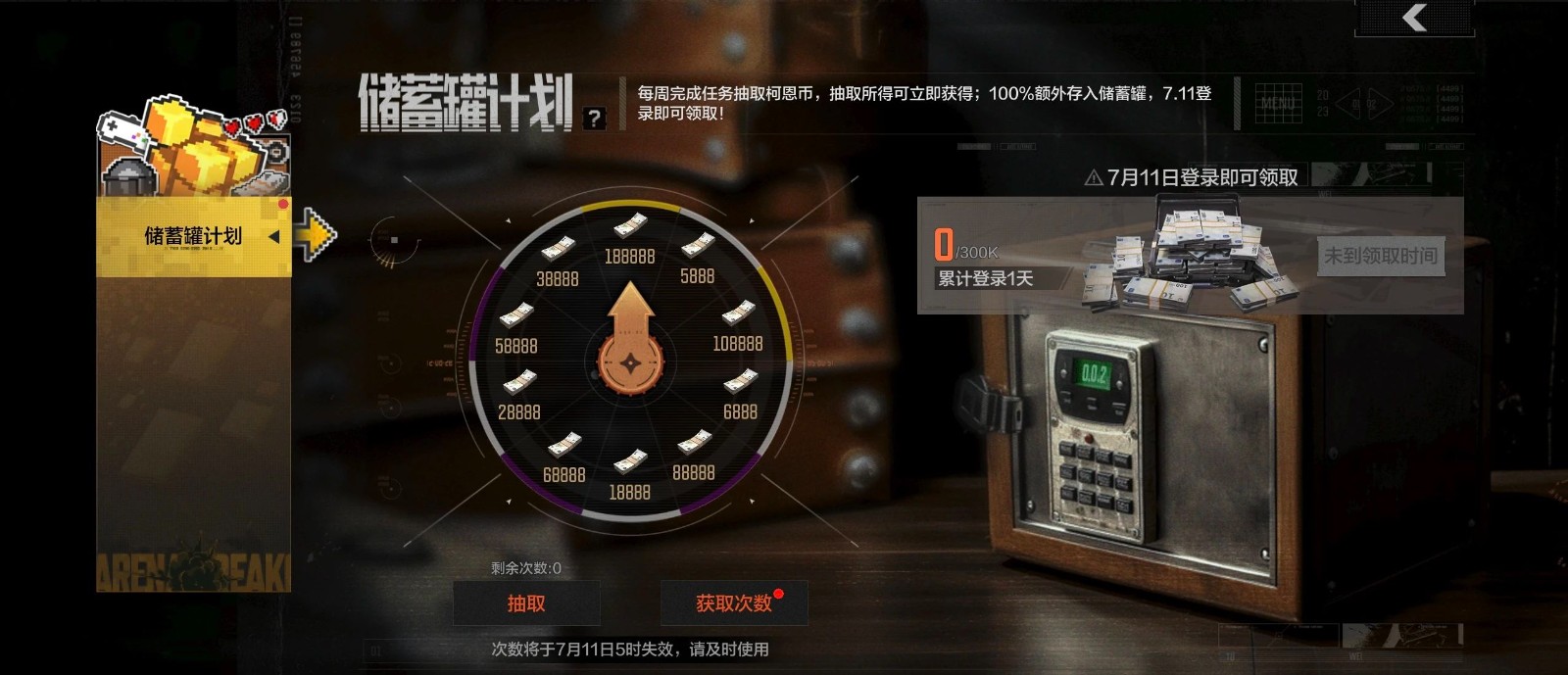 每周完成任务抽取柯恩币,抽取所得可立即获得;100%额外存入储蓄罐,7月11日登录即可领取!