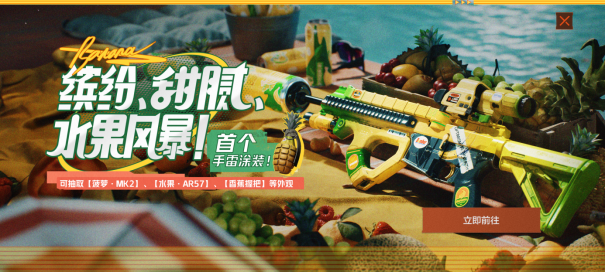 一起上线和玩家见面的还有充满夏日气息的全新军需【缤纷、甜腻、水果风暴】,水果主题的AR57,香蕉一样的握把,还有真.菠萝雷MK2,快去请对手吃一发吧
