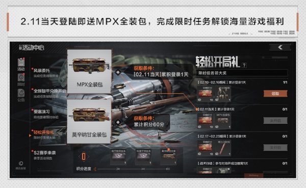 《暗区突围》全新版本还为先锋们带来众多主题福利活动,“轻松开局礼”、“全新腿甲兑换开启”、“迪克文森特供”等活动同步上线。其中,先锋2月11日登录即送MPX全装包;玩游戏攒“突围积分”,就有诸多游戏好礼相送,更有“莫辛纳甘”全装包等你解锁!惊喜加码,2月10日至2月16日、2月17日至2月23日期间上线,先锋还将获得更多惊喜好物,100%有礼!