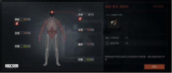为了营造更具沉浸感的战斗体验,《暗区突围》还在对局中引入拟真的生理机制。角色的身体分为头、胸、腹部和四肢,每个部位拥有一定的健康值。其中头部或胸部健康值归0会直接导致撤离失败,而其他部位受伤后也会带来一些不良状态,影响人物身体在战斗中的“性能”,比如:腿部健康值为0后,移动速率会明显降低,不利于撤退和转移;手臂健康值为0时,会降低持枪稳定性,同时搜索速度也会有明显下降,需要玩家时刻保持警惕。
