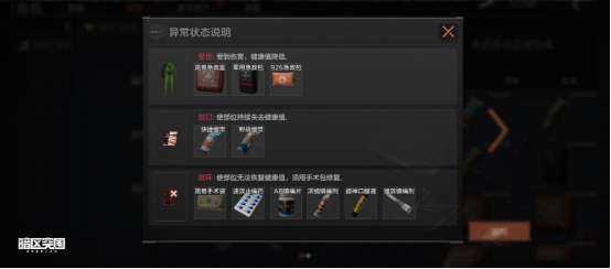 与之对应,在游戏中有多达20余种药品可以治疗不同的不良状态。但要注意,角色的身体状态甚至会延续到局外,下次进入战斗之前切记要治疗自己哦!