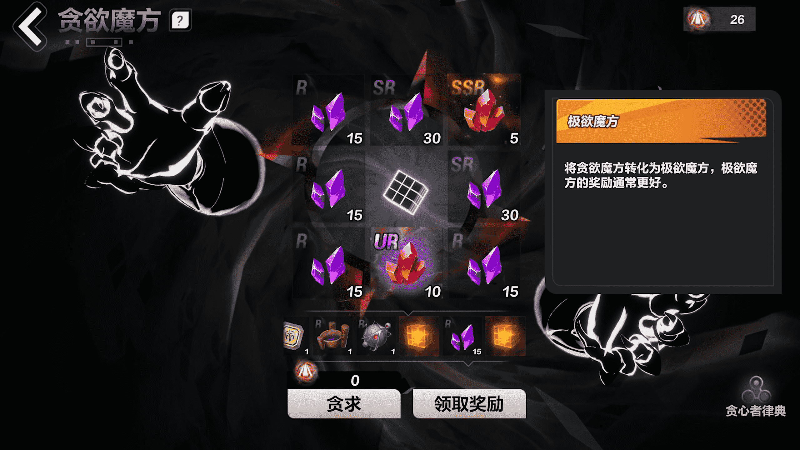 1.“贪欲魔方”里的奖励按照稀有度分为N、R、SSR和UR以及惊喜奖励;