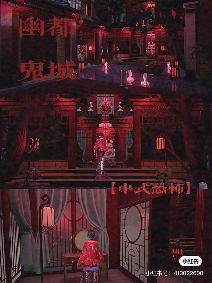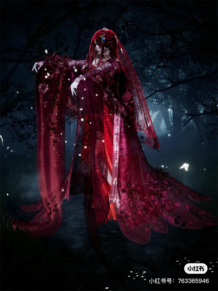 除了这次上线的时装之外,中式恐怖氛围还激起了大家创造的灵感,比如在午夜时分看到这样的场面,幽暗的森林背景搭配暗红的长裙,红色面纱更添诡异之感。