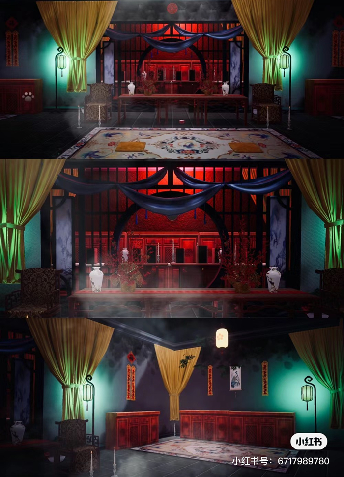 把家园打造成木质结构的古典建筑,再配上昏暗的红色蜡烛光,这中式恐怖的氛围感不就来了!