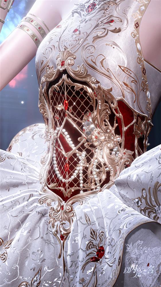 鞋子的设计已经如此用心了,套装的设计概念和主题更是一目了然。要将中国传统德化白瓷与泉州提线木偶戏的设计元素融合在一套服装上,还是有很大挑战性的,除了整体的用色和陶瓷的质感之外,此次的傀儡之章新版本的主推套装还增加了许多更有趣的设计。比如为了凸显腰部的线条,在参考前期发条之心套装镂空腹部的设计之外,这一次官方给这个镂空的设计加入了浓墨重彩的一笔。正如在版本宣传片中看到的那样,一只点缀着各种宝石和水晶的金属小鸟,仿佛为这个镂空设计注入了灵魂。更惊喜的地方在于,镂空双开门鸟笼打开的时候,居住在其中的小鸟便会飞奔而出,与角色紧紧相随并进行专属的亲密互动。