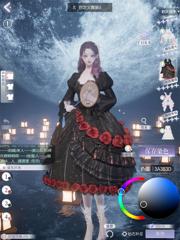 闪暖的以周年庆的闪耀套装(与以闪六星同级)梦魇裙子为例,这件时装有5个染色分区,但5个分区都是一键换色,而且随着染色还会出现细节、光影效果丢失的情况,染色让裙子失去了质感。