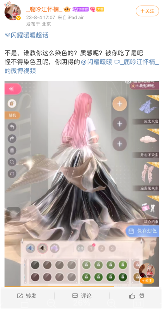 其他闪耀服装也是类似的效果,甚至下图这件本身带渐变的裙子,在染色后渐变消失了,还不如不染。