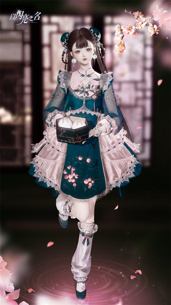 《以闪亮之名》此次的破晓守望新版本也带来了另外一套新中式风格的五星竹雀鸣枝套装。与龙妈的霸气和力量感相对,竹雀鸣枝则活灵活现地展现出了内敛可爱的东方小厨娘的小家碧玉。这套五星套装裙子采用Lolita裙的版型,面料的选择上则使用了带有传统国风花纹的提花缎面,裙子上通过大面积的枇杷刺绣的图案点缀,再一次展现出了《以闪亮之名》对传统中式和现代服装设计的审美造诣。