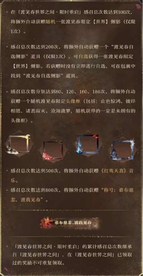 「渡见春世界之间 · 限时重启」的累计感召总次数继承自「渡见春世界之间」。