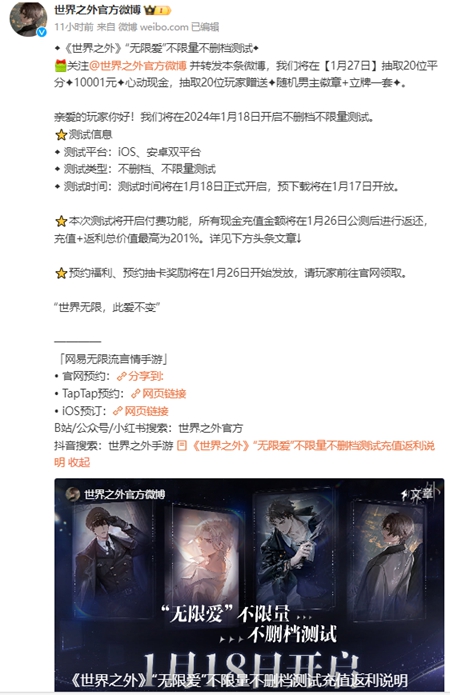 《世界之外》”无限爱“不删档、不限量付费测试将于2024年1月18日开始,关注世界之外官方平台,各渠道将在1月17日开启预下载,期待与你相遇在这个无限世界。
