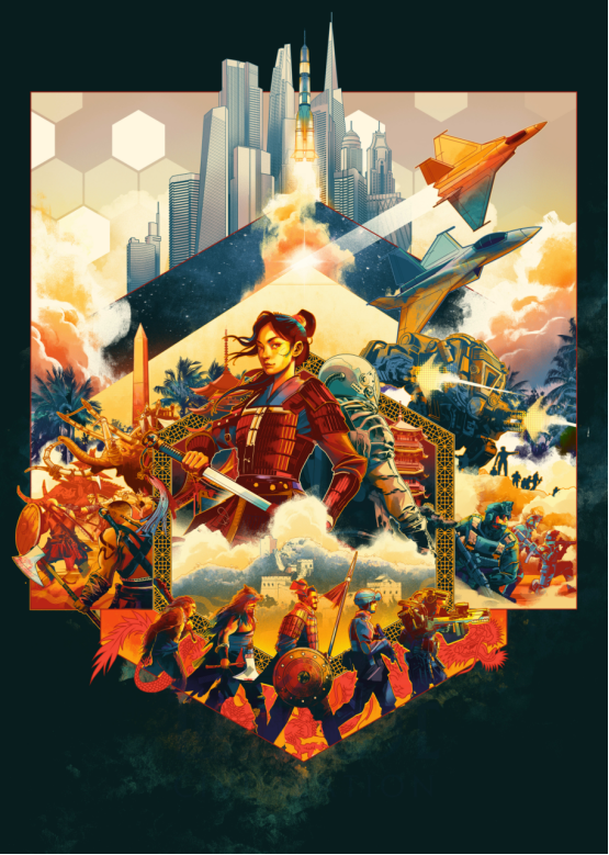 而操刀该海报的艺术设计师Matt Taylor还曾为《黑豹》《银河护卫队》《惊奇队长》《复仇者联盟》《哥斯拉大战金刚》等影视作品设计过海报作品。作为业内顶尖的海报设计师,对于《世界启元》这则艺术海报,他以《文明》系列最典型的六角形格子作为视觉中心,将玩家最初的伙伴“木兰”置于C位,通过多种游戏内容的交叉呈现,制作出了能打动玩家且具备顶级艺术水准的作品。