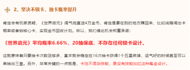 不仅抽数多得吓人,《世界启元》关于抽卡的设计也足以让人一惊,游戏不仅有低于同品类的20抽保底,还有高于同行的6.66%抽卡概率,而且在测试阶段,已经有众多玩家验证了游戏的的确确没有锁卡机制,官方公布的数据一切属实。